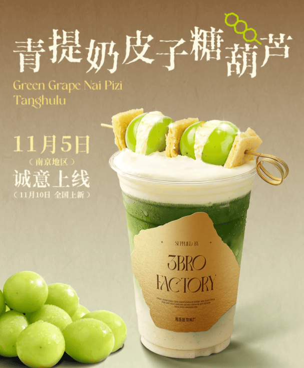 马伍旺“青提奶皮子糖葫芦”据马伍旺官方介绍,新品选用来自浙江径山的抹茶,融合卫岗有机牛奶,添加浓郁香草籽,同时顶部搭配由内蒙奶皮子、青提鲜果搭配安佳淡奶油夹心串成的糖葫芦,淋上麦芽糖浆,口感醇厚回甘。