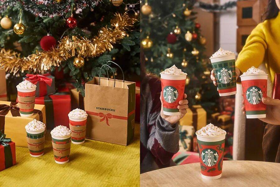 以及同时亮相的还有标志性的“节日红杯”,这次有 4 款设计,当中融入了蝴蝶结、绿色格纹等元素,这呼应了星巴克店员围巾系带的蝴蝶结以及冬日的温暖织物。