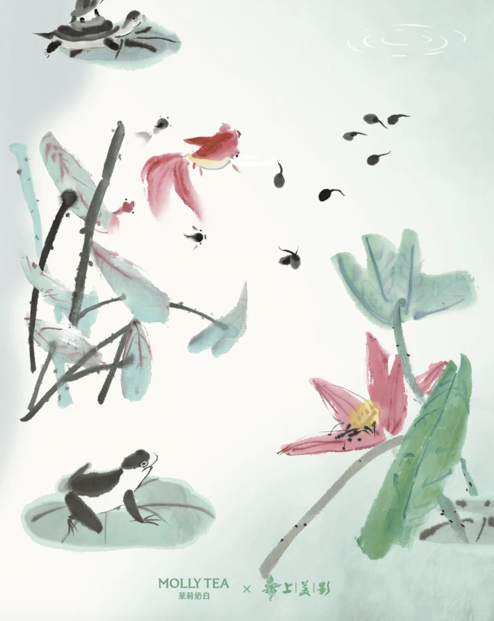 联名融合了《小蝌蚪找妈妈》「寻找家园」的故事内核与茉莉奶白「寻源东方」的品牌主旨,将动画中的「池塘」喻为精神家园,希望用东方叙事实现全球情绪共鸣,并体现文化自信。联名的视觉风格延展自 60 余年前的上美影原画,将渐变水墨蝌蚪、荷叶等元素融入整体视觉与周边等设计,传递中式美学。