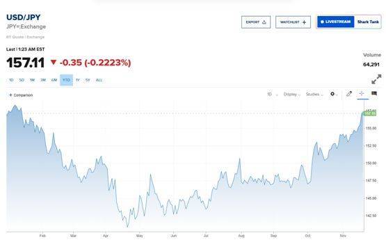 这一庞大的刺激计划此前已引发了市场对日本财政状况恶化的担忧,日元汇率与日本国债本月几乎同步大跌。尽管11月21日刺激计划正式公布后,美元兑日元小幅回落,短暂走低至157.20,但随后再度反弹,逼近可能触发日本央行干预的区间。自从9月以来,日元已在G10货币中领跌;日本10年期国债收益率本周早些时候也进一步跃升至了17年来的最高位。
