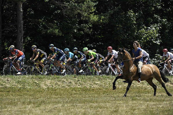 荷兰乐透车队的罗格利奇7月19日创造了历史,他在2017年环法自行车赛第17赛段中夺得冠军,成为这项拥有百余年历史的赛事中首位夺得赛段冠军的斯洛文尼亚车手。快步车队的基特尔无疑是最郁闷的人,这位今年五次称雄平路赛段冠军的德国车手途中遭遇撞车,因伤无奈退赛,象征“冲刺王”的绿衫也被交到了澳大利亚车手马修斯手中。图为一名观众策马经过骑行中的选手。