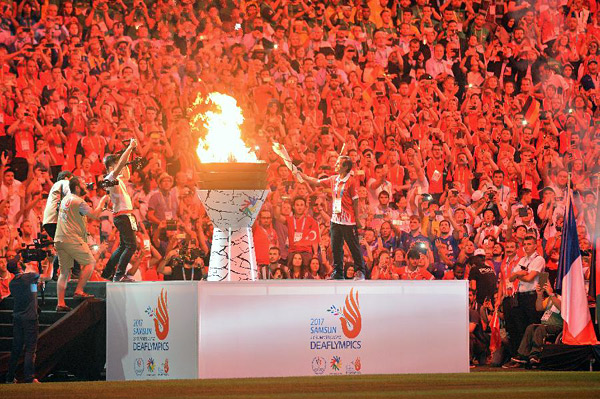 7月18日,土耳其听障足球运动员埃尔图鲁尔·布尔萨点燃奥运圣火。当日,第23届夏季听障奥林匹克运动会在土耳其海滨城市萨姆松开幕,来自97个国家和地区的3100余名听障运动员将在21个运动大项展开角逐。