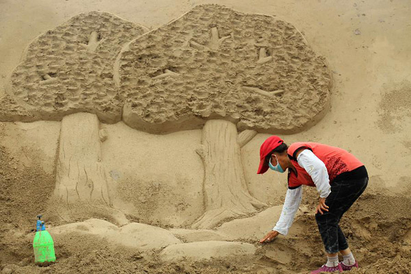7月19日,沙雕艺术家在山东省滨州市高新区沙雕主题公园创作。滨州高新区位于黄河下游三角洲腹地,依托黄河沙土资源打造占地100亩的黄河沙雕主题公园,设沙滩雕塑区、浮雕区、漫画写真区等多个版块。目前,沙雕艺术家正在对30余组沙雕作品精雕细琢,预计8月上旬正式对外开放。