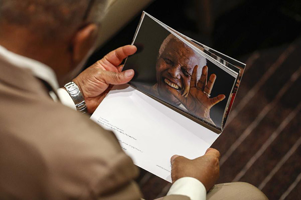 7月18日,在位于纽约的联合国总部,一名与会者在曼德拉国际日纪念活动上翻看曼德拉的照片。第71届联大18日举行“纳尔逊·曼德拉国际日”纪念大会。