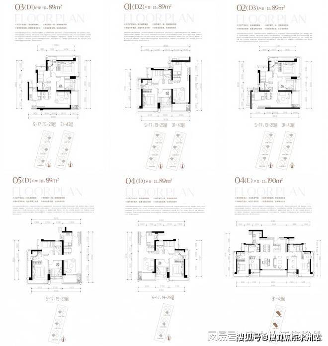 小面积产品,89-190㎡3-4房,楼栋结构均为中低区3T5,高区3T4,高度为43F。户型有约89㎡三房二卫,高区有约190㎡四房三卫,由两个D户型合并而成。