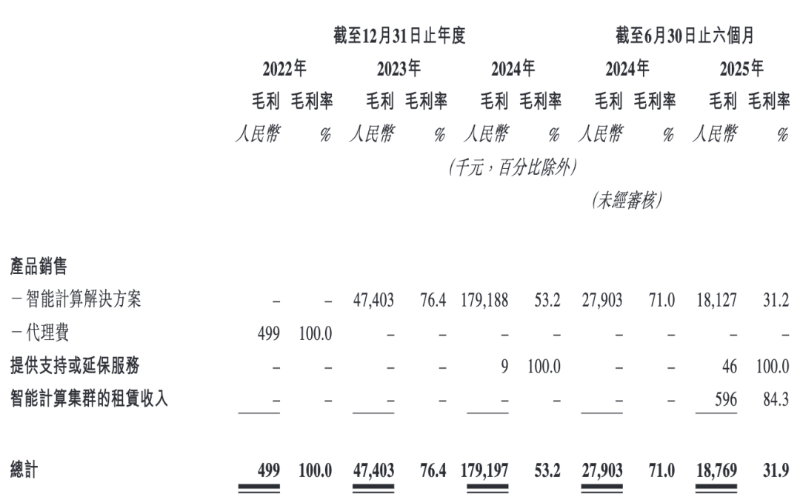 更让人担忧的是剧烈波动的毛利率,壁仞科技自2023年实现商业化,毛利率从2023年的76.4%跌至2024年的53.2%,今年上半年更是从去年同期的71%进一步跌至31.9%,公司称这与智能计算解决方案毛利率的变动一致。