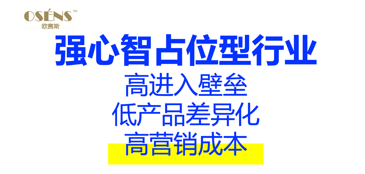而从行业特性来看,强心智占位型行业往往具备 “高进入壁垒、低产品差异化、高营销成本” 的特征:快消品的渠道建设需要巨大投入,全国性的经销商网络、终端货架资源几乎被头部品牌垄断;产品配方、生产工艺的同质化严重,新品牌很难通过产品创新实现突围;营销层面,头部品牌每年投入数十亿广告费巩固心智,新品牌的营销预算往往杯水车薪,难以形成有效传播。
