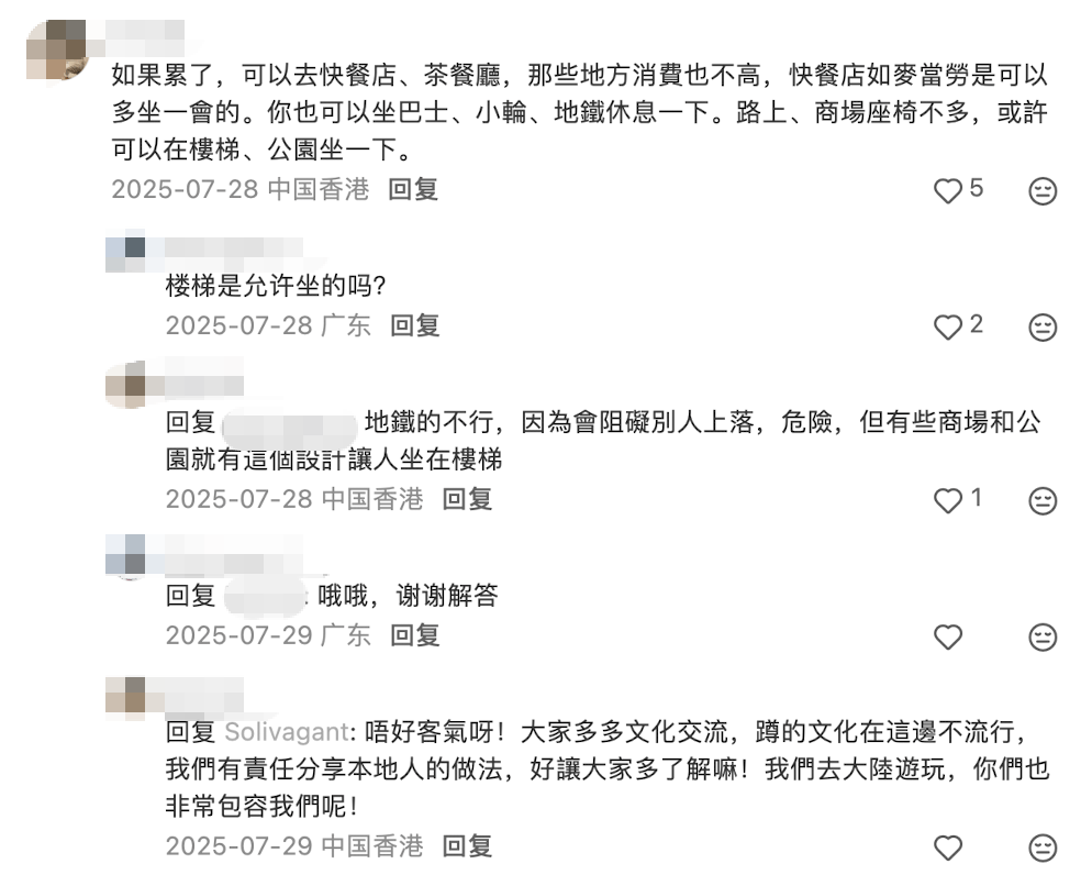 还有香港网友解释「如果累了可去快餐店、茶餐厅,那些地方消费也不高……也可以在楼梯、公园休息一下。」网友追问之后,还热心解释具体不可以蹲的原因。